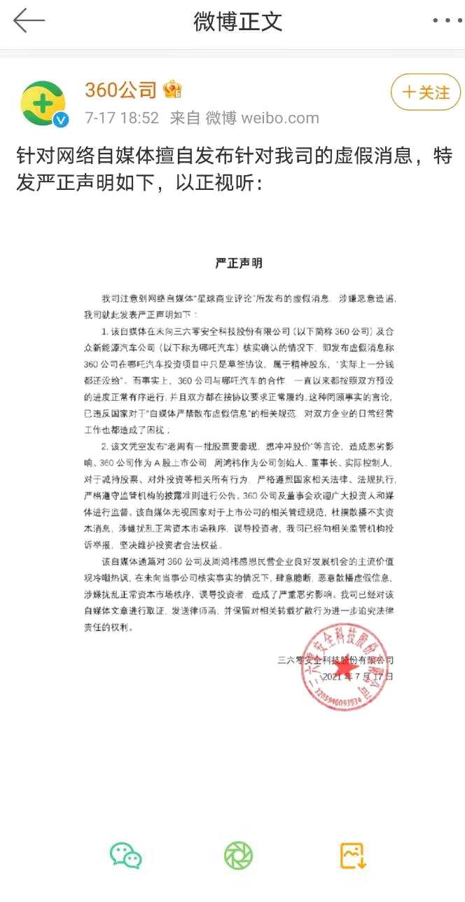 摘要: 今日晚間,針對(duì)某自媒體擅自發(fā)布“360公司在哪吒汽車投資項(xiàng)目中只是草簽協(xié)議,屬于精神股東”的虛假消息,三六零(601360)安全科技股份有限公司(股票代碼:601360.SH,