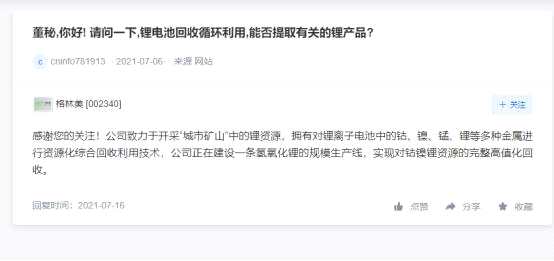 7月16日,格林美在互動(dòng)平臺(tái)稱(chēng):公司正在建設(shè)一條氫氧化鋰的規(guī)模生產(chǎn)線,實(shí)現(xiàn)對(duì)鈷鎳鋰資源的完整高值化回收。