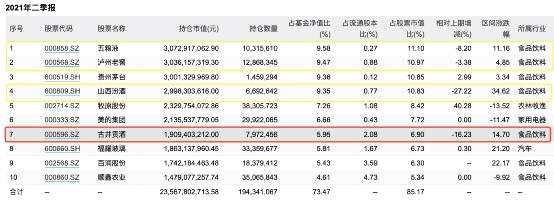 此外,作為古井貢酒一季度第三大股東的易方達(dá)消費(fèi)行業(yè)基金,該基金在二季度同樣減持了古井貢酒,同時五糧液、瀘州老窖(000568)、山西汾酒等白酒股也遭減持。前十大重倉股的白酒股中,只有貴州茅臺(600519)的持倉數(shù)量沒有發(fā)生變動,并從第四大重倉股躍升為第三大重倉股。