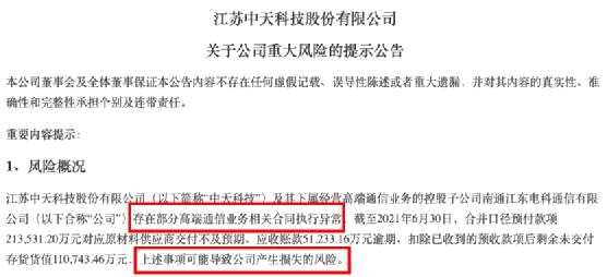 7月21日晚間,中天科技發(fā)布《關(guān)于公司重大風(fēng)險的提示公告》,公告稱,江蘇中天科技股份有限公司(以下簡稱“中天科技”)及其下屬經(jīng)營高端通信業(yè)務(wù)的控股子公司南通江東電科通信有限公司(以下合稱“公司”)存在部分高端通信業(yè)務(wù)相關(guān)合同執(zhí)行異常,截至2021年6月30日,合并口徑預(yù)付款項213,531.20萬元對應(yīng)原材料供應(yīng)商交付不及預(yù)期、應(yīng)收賬款51,233.16萬元逾期、扣除已收到的預(yù)收款項后剩余未交付存貨貨值110,743.46萬元,上述事項可能導(dǎo)致公司產(chǎn)生損失的風(fēng)險。