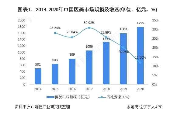圖1 2014-2020年中國醫(yī)美市場規(guī)模及增速(單位:億元,%)