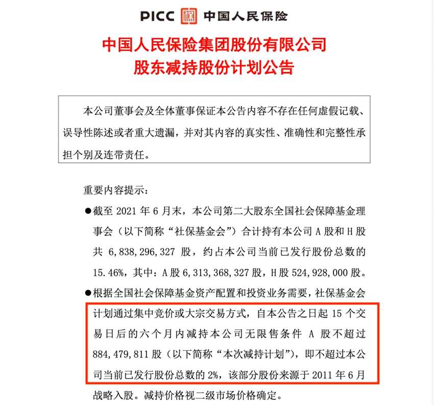 中國人保23日晚間發(fā)布的股東減持股份計(jì)劃公告顯示,社保基金會計(jì)劃通過集中競價(jià)或大宗交易方式,自本公告之日起15個(gè)交易日后的6個(gè)月內(nèi)減持公司無限售條件A股不超過約8.84億股,即不超過公司當(dāng)前已發(fā)行股份總數(shù)的2%。