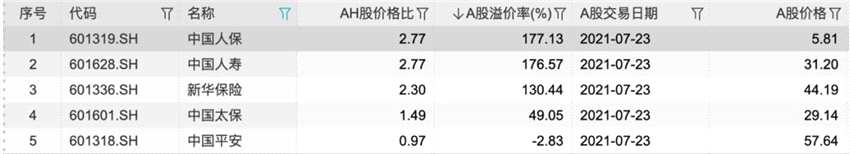 數(shù)據(jù)顯示,截至7月23日收盤,A股五大龍頭保險(xiǎn)股中,中國人保AH溢價(jià)率最高,達(dá)到177%。