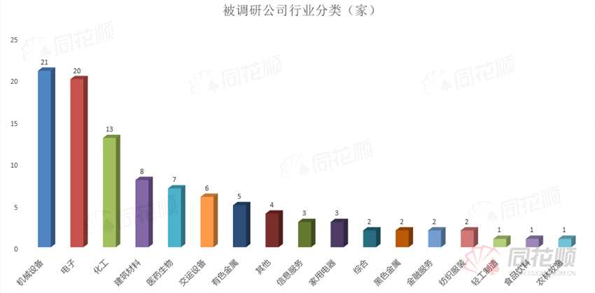 過去一周,A股三大指數(shù)先揚后抑,維持4天的小幅震蕩拉升后,周五集體迎來下挫,滬指周漲0.31%,深成指周漲0.38%,創(chuàng)業(yè)板周漲1.08%。根據(jù)同花順(300033)問財數(shù)據(jù)顯示,上周機構(gòu)調(diào)研公司數(shù)較前期下降幅度為39.64%,不過仍有102家公司接待機構(gòu)調(diào)研。行業(yè)分類上,機械設(shè)備、電子、化工依舊是機構(gòu)調(diào)研熱門方向,分別有21家、20家、13家公司接待機構(gòu)調(diào)研。