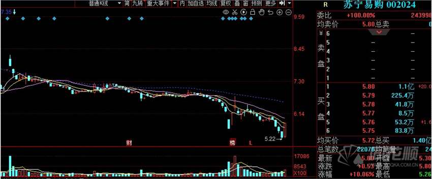 7月29日,蘇寧易購(gòu)(002024)漲停,截至發(fā)稿,蘇寧易購(gòu)漲10.06%報(bào)5.8元,成交額達(dá)2.94億元。今年以來(lái),蘇寧易購(gòu)跌幅超20%。