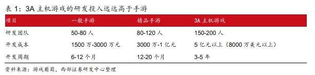 3A游戲的研發(fā)投入遠(yuǎn)遠(yuǎn)高于手游,不少手游公司都表示沒必要投入制作做“類 3A”的大制作游戲,因?yàn)椤安毁嶅X”。據(jù)西部證券(002673)測算,目前階段精品手游的 ROI 確實(shí)遠(yuǎn)高于海外3A游戲。