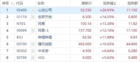 今天心動(dòng)公司尾盤收漲26.93%,報(bào)52.55港元,于港股游戲板塊中漲幅最高。