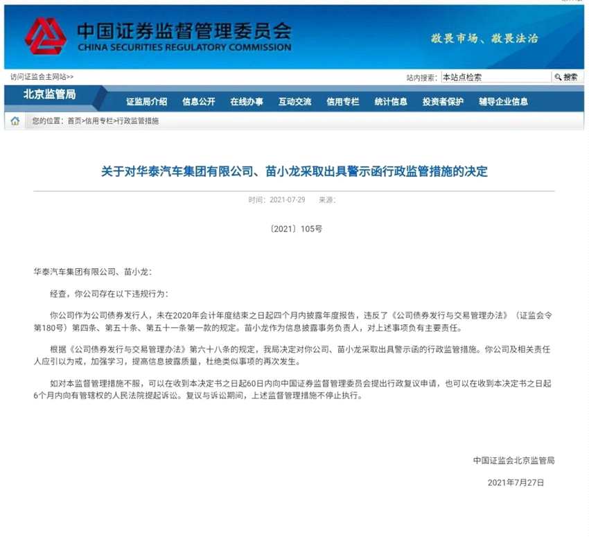 北京證監(jiān)局表示,作為公司債券發(fā)行人,華晨汽車集團未在2020年會計年度結(jié)束之日起四個月內(nèi)披露年度報告,違反了《公司債券發(fā)行與交易管理辦法》(證監(jiān)會令第180號)第四條、第五十條、第五十一條第一款的規(guī)定。苗小龍作為信息披露事務負責人,對上述事項負有主要責任。根據(jù)《公司債券發(fā)行與交易管理辦法》第六十八條的規(guī)定,我局決定對你公司、苗小龍采取出具警示函的行政監(jiān)管措施。