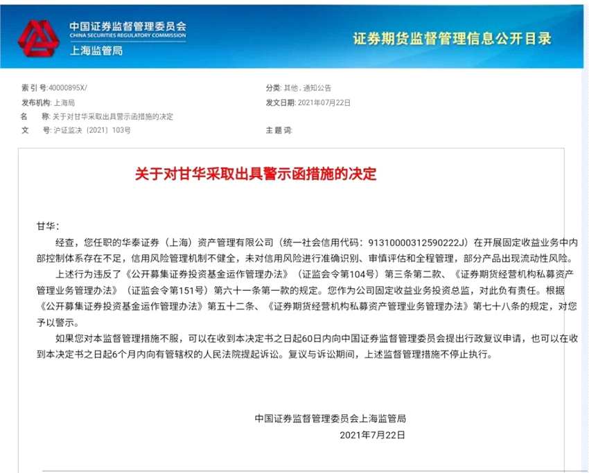 作為公司固定收益業(yè)務投資總監(jiān),華泰證券資管的甘華也一并接到了監(jiān)管警示函。