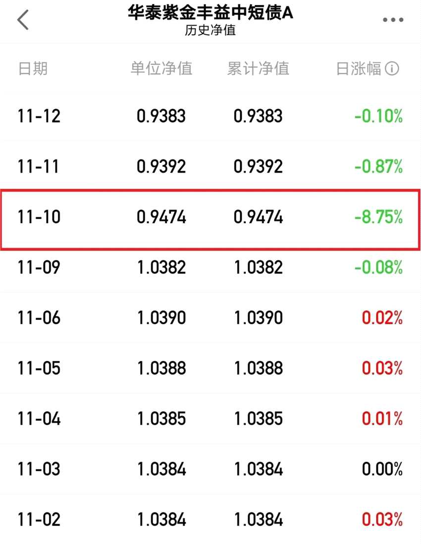 數(shù)據(jù)顯示,2020年11月10日,華泰紫金豐益中短債基金凈值單日大跌8.75%,華泰紫金豐利中短債、華泰紫金周周購3個月凈值分別下跌3.51%、3.02%,華泰紫金智盈債券、華泰紫金豐泰純債凈值也均出現(xiàn)1%以上的跌幅。