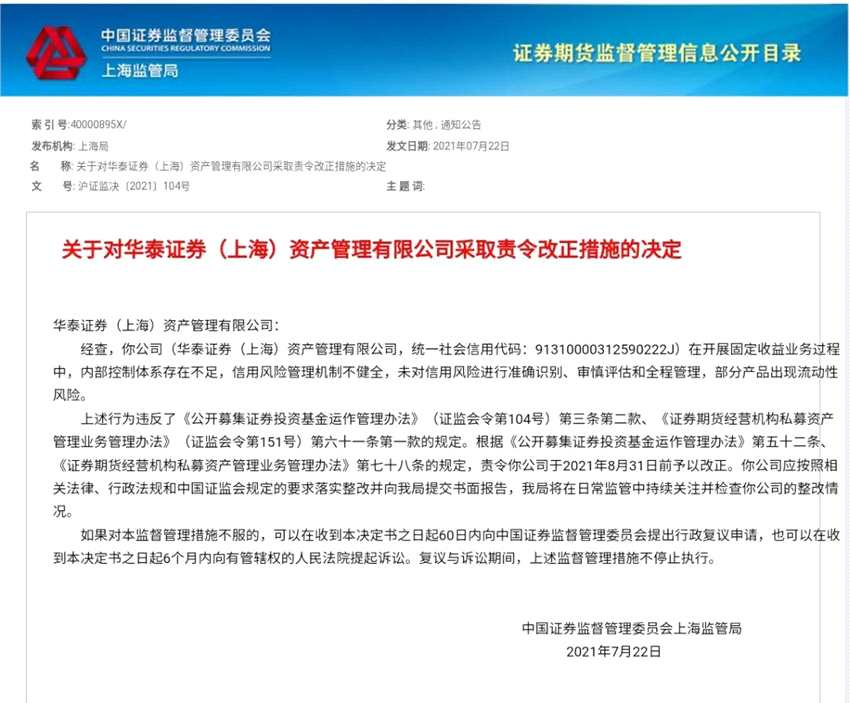 上海證監(jiān)局對外披露了一份《關于對華泰證券(上海)資產(chǎn)管理有限公司采取責令改正措施的決定》,決定中稱,經(jīng)查,華泰證券(上海)資產(chǎn)管理有限公司在開展固定收益業(yè)務過程中,內(nèi)部控制體系存在不足,信用風險管理機制不健全,未對信用風險進行準確識別、審慎評估和全程管理,部分產(chǎn)品出現(xiàn)流動性風險。