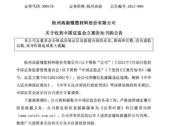 7月30日晚間,杭州高新發(fā)布公告稱(chēng),因公司涉嫌信息披露違法違規(guī),中國(guó)證監(jiān)會(huì)決定對(duì)公司進(jìn)行立案調(diào)查。