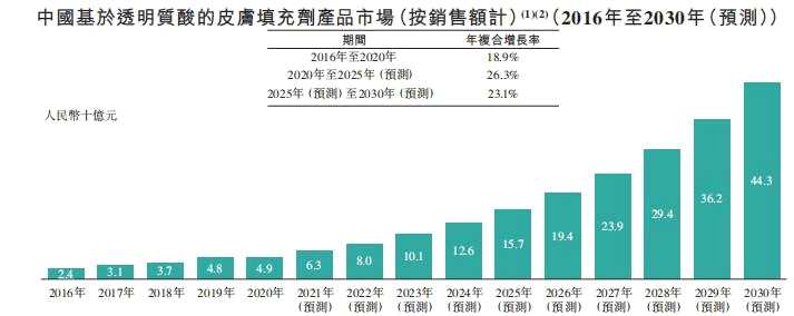 據(jù)弗若斯特沙利文報告,中國醫(yī)美肉毒毒素產(chǎn)品市場規(guī)模從2016年的15億元增長至2020年的39億元,復(fù)合年增長率約為26.9%。預(yù)計到2030年,這一市場規(guī)模有望提高至296億元。