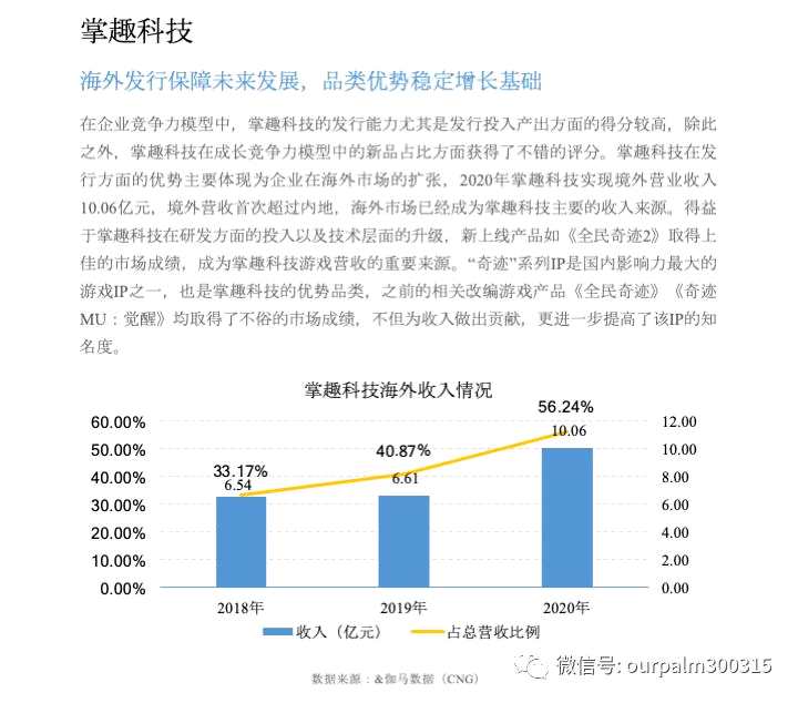 發(fā)行方面,掌趣科技近年來(lái)深入推進(jìn)研運(yùn)一體化轉(zhuǎn)型,著力構(gòu)建全球化的研發(fā)發(fā)行體系并積極整合海內(nèi)外優(yōu)勢(shì)資源,取得了突出成果。2020年,公司實(shí)現(xiàn)境外營(yíng)業(yè)收入10.06億元,首次超過(guò)內(nèi)地,海外市場(chǎng)已成為掌趣科技主要的收入來(lái)源。旗下《一拳超人:最強(qiáng)之男》、《拳皇98終極之戰(zhàn)OL》、《奇跡MU:覺(jué)醒》、《魔法門(mén)之英雄無(wú)敵:戰(zhàn)爭(zhēng)紀(jì)元》等自研精品游戲在海外市場(chǎng)多點(diǎn)開(kāi)花,覆蓋日韓、東南亞、歐美等全球主流游戲市場(chǎng)。