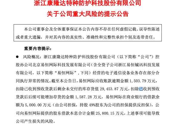康隆達(dá)在公告中稱,截至公告日,易恒網(wǎng)際應(yīng)收賬款逾期金額1503.79萬元,扣除已收到預(yù)收貨款后剩余未交付的庫存貨值2.95億元,扣除已收到預(yù)收貨款后后續(xù)可能增加存貨的金額1587.28萬元,易恒網(wǎng)際在商業(yè)銀行的借款余額為5000萬元,公司向易恒網(wǎng)際提供的股東借款本息合計(jì)金額2.58億元,上述事項(xiàng)可能導(dǎo)致公司產(chǎn)生損失的風(fēng)險(xiǎn)。