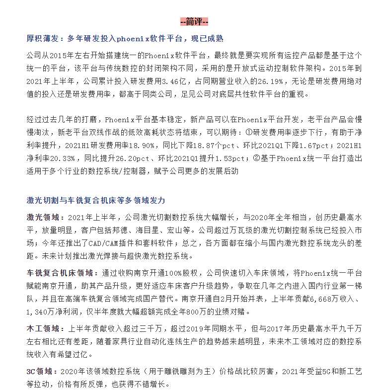 7月30日中信建投(601066)火速給出買入評級,該券商發(fā)布了一篇名為“厚積薄發(fā),激光與車銑等領域開始發(fā)力”的簡報,簡報指出公司在激光切割與車銑復合機床等多領域發(fā)力,激光方面在縮小與國內激光數(shù)控系統(tǒng)龍頭的差距,南京開通僅半年度就大幅超額完成全年業(yè)績對賭等。