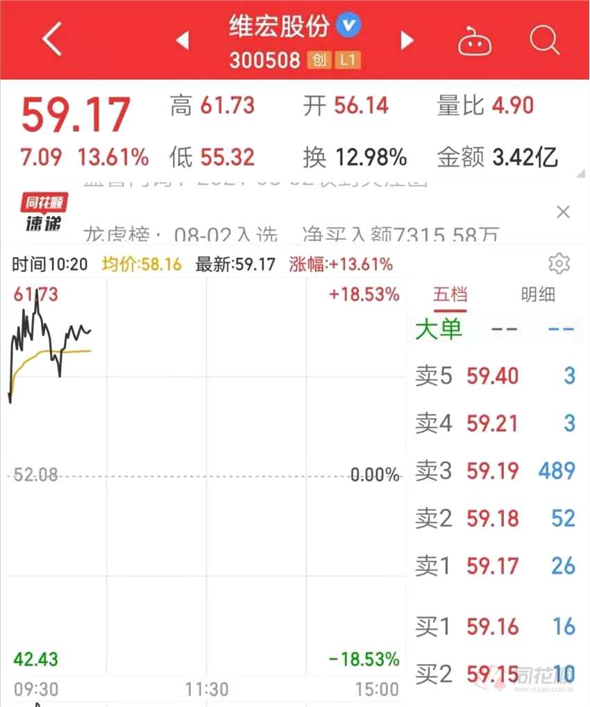 8月3日,創(chuàng)業(yè)板上市公司維宏股份(300508)再度強勢沖高,截至發(fā)稿,公司股價大漲13.61%,報59.17元,成交額3.42億元。