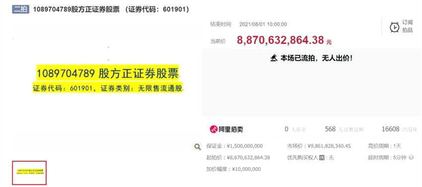 方正證券(601901)8月2日晚間公告,北京政泉控股有限公司(簡(jiǎn)稱“政泉控股”)持有的10.90億股公司股份在阿里法拍平臺(tái)第二次公開拍賣,最終仍以流拍告終。