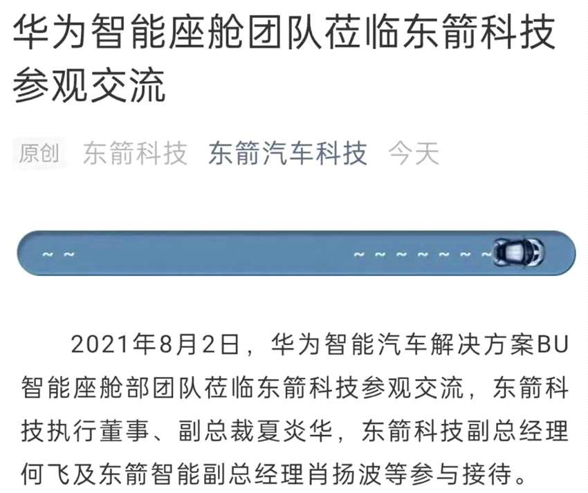 8月3日,東箭科技官微發(fā)布消息稱(chēng),8月2日,華為智能汽車(chē)解決方案BU智能座艙部團(tuán)隊(duì)蒞臨東箭科技參觀(guān)交流,東箭科技執(zhí)行董事、副總裁夏炎華,東箭科技副總經(jīng)理何飛及東箭智能副總經(jīng)理肖揚(yáng)波等參與接待。