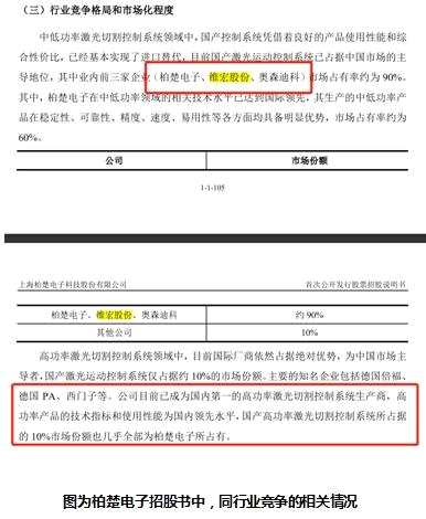 目前,在國內(nèi)激光切割控制系統(tǒng)領(lǐng)域中,柏楚電子是龍頭企業(yè),該公司于2019年上市。根據(jù)柏楚電子招股書顯示,在中低功率激光切割控制系統(tǒng)領(lǐng)域中,業(yè)內(nèi)前三家企業(yè)分別為柏楚電子、維宏股份、奧森迪科,三者市場占有率合計約為90%,其中,柏楚電子在中低功率領(lǐng)域市場占有率約為60%;在高功率激光切割控制系統(tǒng)領(lǐng)域中,國際廠商為中國市場主導者,國產(chǎn)激光運動控制系統(tǒng)僅占據(jù)約 10%的市場份額,而這10%市場份額也幾乎全部為柏楚電子所占有。