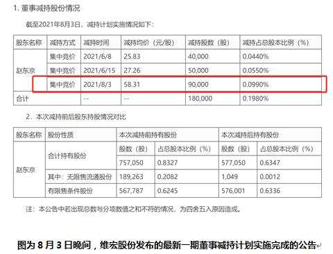記者注意到,8月3日晚間,維宏股份發(fā)布了最新一期董事減持計劃實施完成的公告。公告顯示,公司于2021年3月15日披露的公司董事、副總經(jīng)理、產(chǎn)品體系總監(jiān)趙東京的減持計劃已經(jīng)完成。根據(jù)該公告,減持計劃期間,趙東京共集中競價減持三次,8月3日減持股數(shù)最多,減持均價也是最高。記者還發(fā)現(xiàn),趙東京曾實施了多次減持計劃。