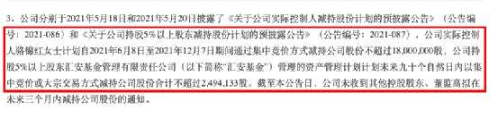 記者注意到,在該則公告的重大風(fēng)險提示項下還提到,公司分別于2021年5月18日和2021年5月20日披露了《關(guān)于公司實(shí)際控制人減持股份計劃的預(yù)披露公告》(公告編號:2021-086)和《關(guān)于公司持股5%以上股東減持股份計劃的預(yù)披露公告》(公告編號:2021-087),公司實(shí)際控制人駱錦紅女士計劃自2021年6月8日至2021年12月7日期間通過集中競價方式減持公司股份不超過18,000,000股,公司持股5%以上股東匯安基金管理有限責(zé)任公司(以下簡稱“匯安基金”)管理的資產(chǎn)管理計劃計劃未來九十個自然日內(nèi)以集中競價或大宗交易方式減持公司股份合計不超過2,494,133股。截至本公告日,公司未收到其他控股股東、董監(jiān)高擬在未來三個月內(nèi)減持公司股份的通知。