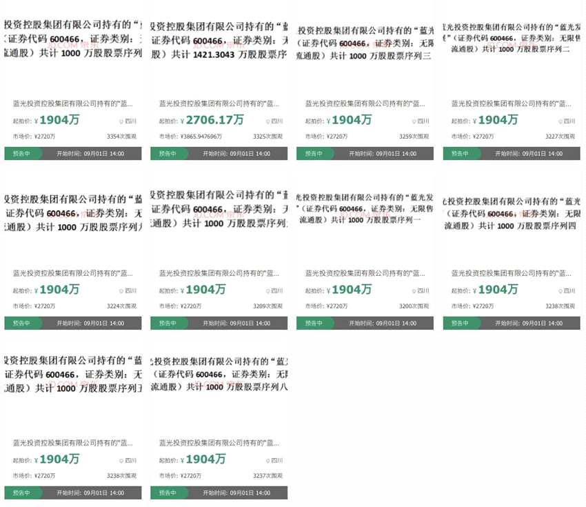 剩余9000余萬股則分為九個標(biāo)的拍賣,均為1000萬股股票,展示價均為1904萬元,市場價均約為2720萬元,保證金均為190.4萬元,加價幅度均為5萬元。