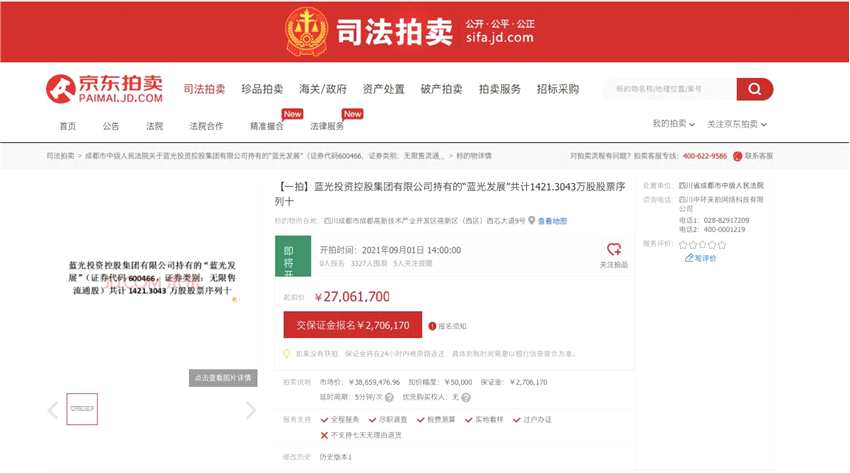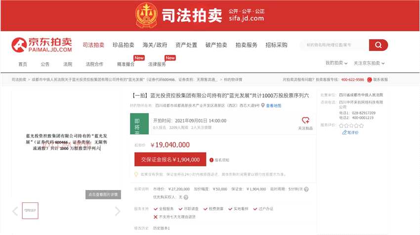 而據(jù)京東網(wǎng)司法拍賣網(wǎng)絡(luò)平臺顯示,四川省成都市中級人民法院將在該平臺,對藍(lán)光發(fā)展大股東藍(lán)光投資控股集團(tuán)有限公司即藍(lán)光集團(tuán)持有“藍(lán)光發(fā)展”股票共計10421.3043萬股,分為10個標(biāo)的進(jìn)行公開拍賣,按照展示價合計1.9842億元,折合每股1.904元。