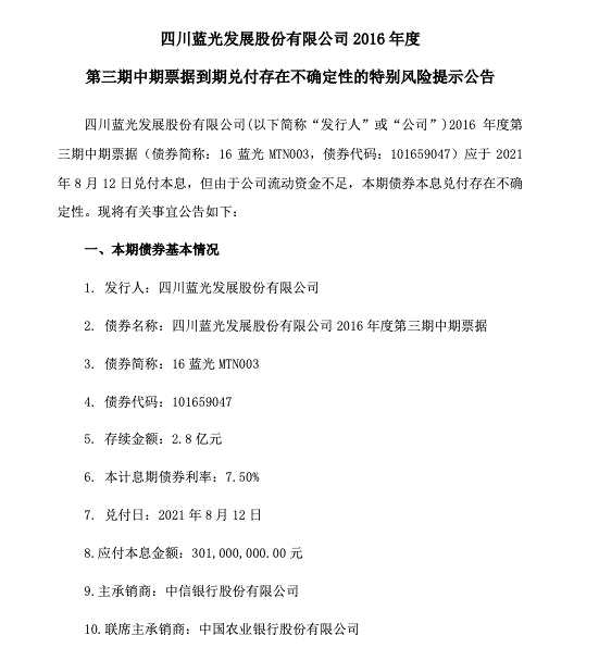 藍(lán)光發(fā)展稱:2016年度第三期中期票據(jù)(債券簡稱:16藍(lán)光MTN003,債券代碼:101659047)應(yīng)2021年8月12日兌付本息,但由于公司流動資金不足,本期債券本息兌付存在不確定性。