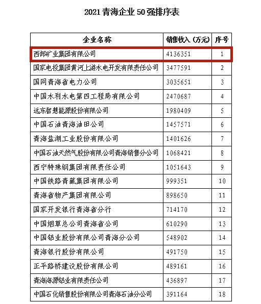 摘要: 喜訊8月6日,由省工業(yè)和信息化廳、省政府國資委、省統(tǒng)計局、省企業(yè)聯(lián)合會、省企業(yè)家協(xié)會共同組織,并經(jīng)省內(nèi)相關(guān)專家委員會審定的“2021年青海企業(yè)50強”名單公布。西部礦業(yè)(601168)集團公司以銷售收