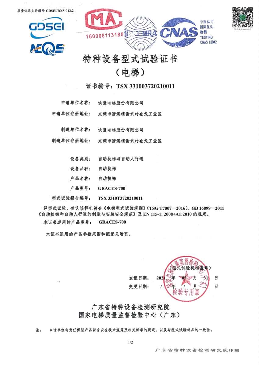 《GRACES-700公共交通重載型自動(dòng)扶梯》型式實(shí)驗(yàn)報(bào)告證書(shū)