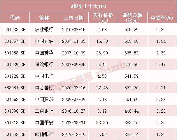 從A股IPO歷史數(shù)據(jù)看,農(nóng)業(yè)銀行(601288)募資額最高,為685.29億元,中國石油(601857)、中國神華(601088)分別募資668億元、665.82億元,居二三位,建設(shè)銀行(601939)募資580.5億元,排在第四位。