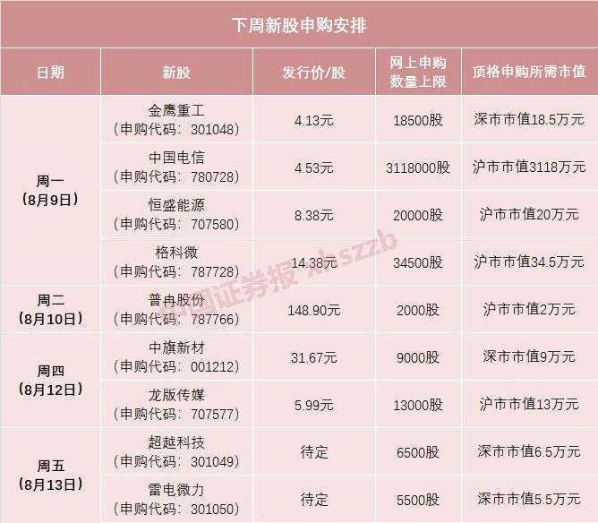摘要: 根據(jù)新股發(fā)行安排,下周A股將有9只新股申購,主板4只、科創(chuàng)板2只、創(chuàng)業(yè)板3只。中國電信(601728)將于下周一進(jìn)行新股申購,若超額配售選擇權(quán)全額行使,預(yù)計其募資總額可達(dá)541.59億元,
