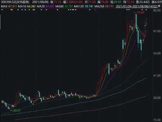 7月30日晚間公布的半年報(bào)顯示,天華超凈今年上半年實(shí)現(xiàn)營(yíng)業(yè)收入14.31億元,較上年同期增長(zhǎng)87.86%;實(shí)現(xiàn)凈利潤(rùn)3.13億元,同比增長(zhǎng)66.57%。從股價(jià)表現(xiàn)來(lái)看,天華超凈今年可謂走勢(shì)非常凌厲,年初至今漲幅超190%。