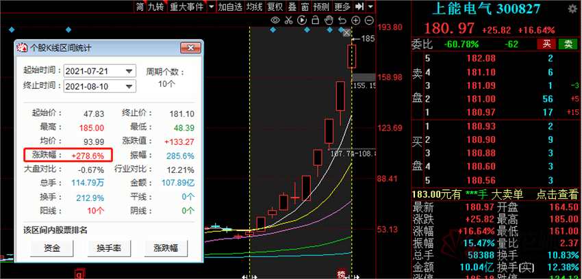近10個(gè)交易日來,上能電氣股價(jià)如同坐上了火箭,從47元一路飆漲至最高185元,期間累計(jì)漲幅已超278%。
