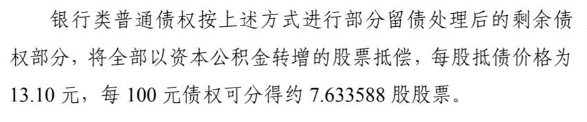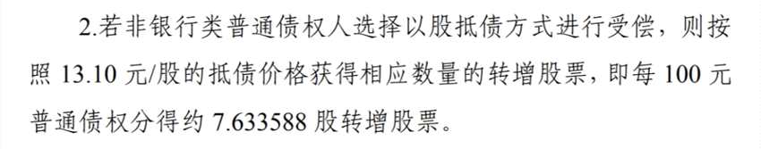 2020年1月,*ST鹽湖(000792)披露重整計(jì)劃,鹽湖股份以27.86億股轉(zhuǎn)增26.47億股,總股本變?yōu)槟壳暗?4.33億股,轉(zhuǎn)增股票向債權(quán)人分配以抵償債務(wù)以及由管理人進(jìn)行處置,其中25.76億股轉(zhuǎn)增股票用于向債權(quán)人抵償債務(wù)。抵債價(jià)格為13.10元/股。