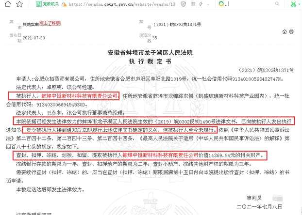 根據(jù)中國裁判文書網(wǎng)發(fā)布的《合肥眾拓商貿(mào)有限公司、蚌埠中恒新材料科技有限責(zé)任公司執(zhí)行實(shí)施類執(zhí)行裁定書》即安徽省蚌埠市龍子湖區(qū)人民法院執(zhí)行裁定書(2021)皖0302執(zhí)1371號(hào),“本院依據(jù)已經(jīng)發(fā)生法律效力的蚌埠市龍子湖區(qū)人民法院生效的(2019)皖0302民初1490號(hào)法律文書,已向被執(zhí)行人發(fā)出執(zhí)行通知書,責(zé)令被執(zhí)行人接到通知后立即履行上述法律文書確定的義務(wù),但被執(zhí)行人至今未履行。依照《中華人民共和國民事訴訟法》第二百四十二條、第二百四十三條、第二百四十四條,《最高人民法院關(guān)于適用〈中華人民共和國民事訴訟法〉的解釋》第四百八十七條的規(guī)定,裁定如下:查封、扣押、凍結(jié)、劃撥、扣留、提取被執(zhí)行人蚌埠中恒新材料科技有限責(zé)任公司價(jià)值14369.94元的相關(guān)財(cái)產(chǎn)。”