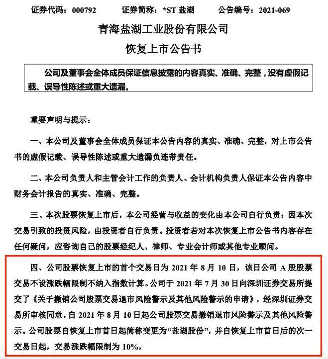 7月31日,暫停上市15個月后,*ST鹽湖發(fā)布公告,讓持有股票的57227戶股東歡呼雀躍。公告稱,*ST鹽湖收到深交所通知,公司股票將于8月10日在深交所恢復(fù)交易,同時,公司向深交所提交了撤銷公司股票交易退市風(fēng)險警示及其他風(fēng)險警示的書面申請,待交易所核準(zhǔn)后,公司股票簡稱由*ST鹽湖變更為鹽湖股份。