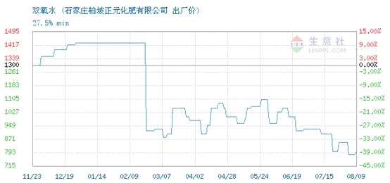 顯示,27.5%的雙氧水出廠價在今年呈下跌趨勢。比如,石家莊柏坡正元化肥有限公司27.5%的雙氧水在2020年11月23日的出廠價為1300元/噸,而截至2021年8月9日的出廠價為800元/噸,下降了38.46%。