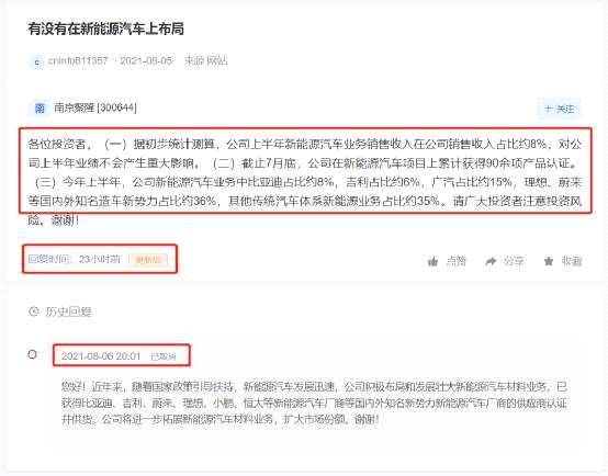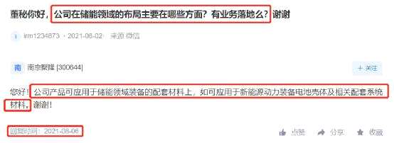 記者查詢了此前南京聚隆包括年報在內(nèi)的各種公告、以及深交所互動平臺,均未發(fā)現(xiàn)南京聚隆曾經(jīng)在公開渠道披露公司在儲能領(lǐng)域的布局。而這一點顯然也引起投資者關(guān)注,8月2日,有投資者在互動平臺上進一步提出疑問,“公司在儲能領(lǐng)域的布局主要在哪些方面?有業(yè)務(wù)落地么?”8月6日,公司做出回復(fù),表示“公司產(chǎn)品可應(yīng)用于儲能領(lǐng)域裝備的配套材料上,如可應(yīng)用于新能源動力裝備電池殼體及相關(guān)配套系統(tǒng)材料?!?/p>