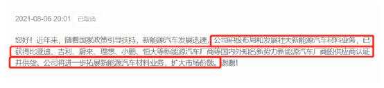 同時,南京聚隆還表示,“近年來,隨著國家政策引導(dǎo)扶持,新能源汽車發(fā)展迅速,公司積極布局和發(fā)展壯大新能源汽車材料業(yè)務(wù),已獲得比亞迪(002594)、吉利、蔚來、理想、小鵬、恒大等新能源汽車廠商等國內(nèi)外知名新勢力新能源汽車廠商的供應(yīng)商認證并供貨。公司將進一步拓展新能源汽車材料業(yè)務(wù),擴大市場份額。”不過目前,深交所互動平臺上該回答已被取消。