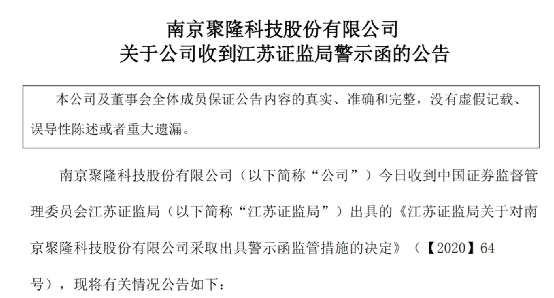 到了2020年7月24日,南京聚隆公告收到《關(guān)于對南京聚隆科技(300475)股份有限公司及相關(guān)當(dāng)事人給予通報批評處分的決定》,因未能客觀完整進行信息披露,南京聚隆及相關(guān)當(dāng)事人被通報批評。同日,南京聚隆收到江蘇證監(jiān)局下發(fā)的警示函,指出南京聚隆“在此次股價異動公告中未披露聚丙烯熔噴專用料對主營業(yè)務(wù)收入占比較小的情況,也未說明是否會對公司業(yè)績產(chǎn)生重大影響,信息披露不完整。”