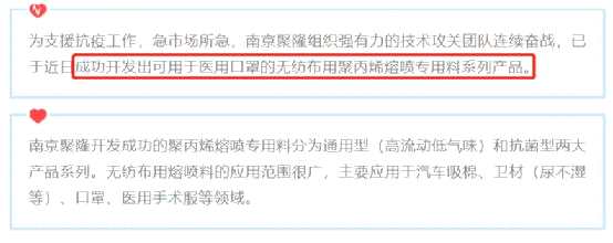 2020年2月28日,南京聚隆在微信公眾號平臺發(fā)布文章,標(biāo)題為“南京聚隆成功開發(fā)出無紡布用聚丙烯熔噴專用料”,當(dāng)時正值新冠疫情期間,文章稱“為支援抗疫工作,急市場所急,南京聚隆組織強有力的技術(shù)攻關(guān)團隊連續(xù)奮戰(zhàn),已于近日成功開發(fā)出可用于醫(yī)用口罩的無紡布用聚丙烯熔噴專用料系列產(chǎn)品。”并表示,“南京聚隆開發(fā)成功的聚丙烯熔噴專用料分為通用型(高流動低氣味)和抗菌型兩大產(chǎn)品系列。無紡布用熔噴料的應(yīng)用范圍很廣,主要應(yīng)用于汽車吸棉、衛(wèi)材(尿不濕等)、口罩、醫(yī)用手術(shù)服等領(lǐng)域?!?/p>