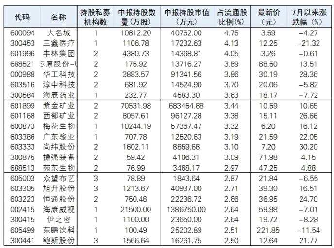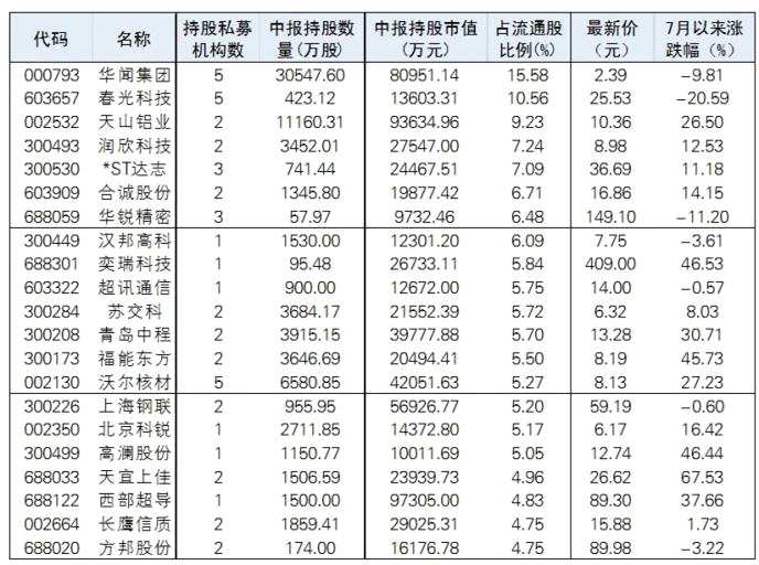 截至昨日,陽光私募二季度末出現(xiàn)在108家上市公司。根據Wind數據顯示,從占流通股比例來看,華聞集團(行情000793,診股)、春光科技(行情603657,診股)、天山鋁業(yè)(行情002532,診股)、潤欣科技(行情300493,診股)等排名居前。從二級市場表現(xiàn)來看,天宜上佳(行情688033,診股)、奕瑞科技(行情688301,診股)、高瀾股份(行情300499,診股)、福能東方(行情300173,診股)等7月以來累計漲幅超過40%。