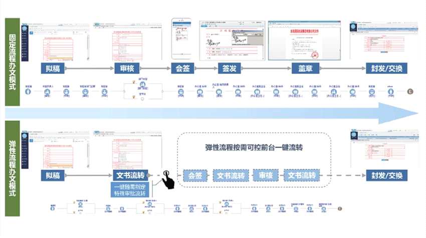 固定流程辦文模式:集團(tuán)辦文最常見的模式,要求收發(fā)文流程完全按照集團(tuán)辦文制度設(shè)定好的流程自動流轉(zhuǎn),匹配仿真紙質(zhì)的電子文單進(jìn)行規(guī)范化管理,收發(fā)文人員僅需直接調(diào)用固定公文模板填寫必要信息即可完成提交進(jìn)行流轉(zhuǎn)。過程中系統(tǒng)自動反饋處理情況,無需過多人工干預(yù)。