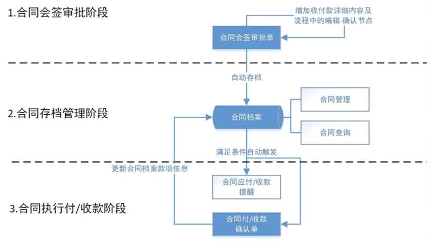 構(gòu)建“合同臺賬”,將原有合同審批流程與臺賬信息打通,實現(xiàn)系統(tǒng)自動沉淀合同數(shù)據(jù),同時基于可個性定制的臺賬信息,完善合同相關(guān)屬性信息,便于統(tǒng)一管理;合同執(zhí)行過程主要通過收、付款關(guān)聯(lián)流程與合同臺賬信息實現(xiàn)實時同步,完成合同款項的及時更新及閉環(huán)風(fēng)險管控。細(xì)節(jié)上通過系統(tǒng)自動的到期、逾期提醒,實現(xiàn)精準(zhǔn)的全電子化管理。通過統(tǒng)一規(guī)范的合同審批流程對合同簽訂過程的合規(guī)性進(jìn)行管控,規(guī)避集團(tuán)法務(wù)風(fēng)險;完成審批的合同自動形成合同臺賬,便于后續(xù)統(tǒng)一管理維護(hù);通過收付款流程與合同臺賬款項信息設(shè)置聯(lián)動,確保合同款項信息的實時更新與及時提醒。