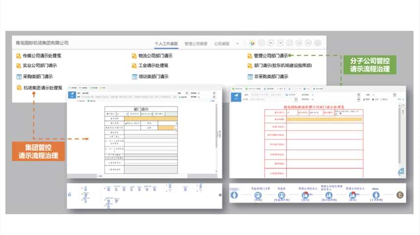 青島機場集團(tuán)的管控運作主要體現(xiàn)在請示報告、辦文、表單、會議四個最基本、最重要的管理方面。以集團(tuán)/ 公司請示為例,集團(tuán)下部署多組織層級場景的全流程審批路徑,通過集團(tuán)- 分子公司特定的組織模型匹配實現(xiàn)不同類型事項在不同組織層級下的上傳下達(dá)過程,使關(guān)鍵請示事項的集團(tuán)化治理更加規(guī)范。