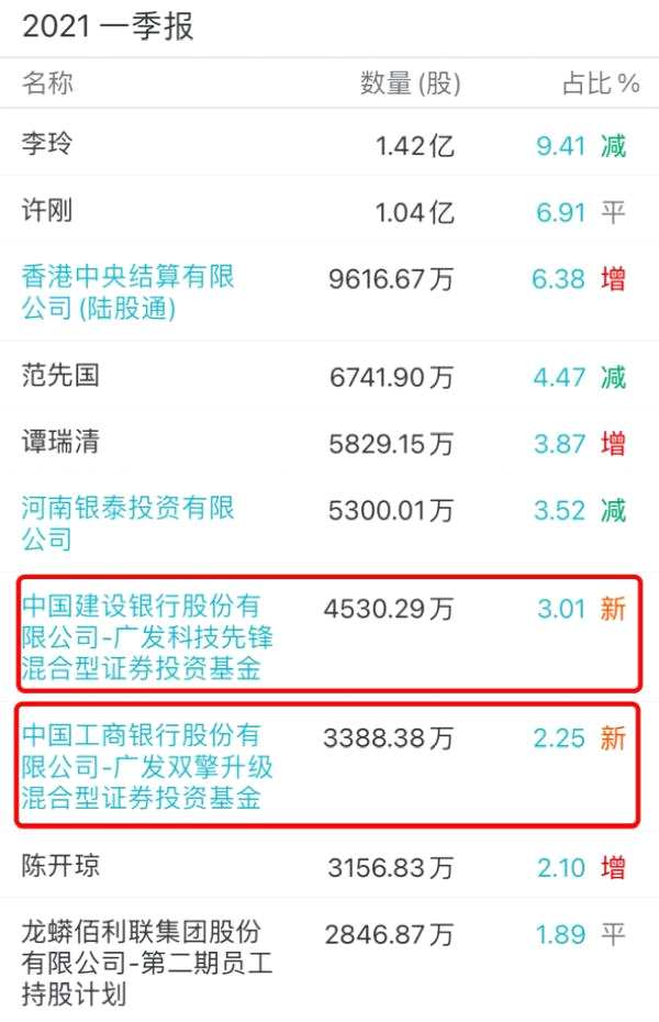 值得關(guān)注的是明星基金經(jīng)理劉格菘管理的廣發(fā)科技先鋒混合基金和廣發(fā)雙擎升級混合基金2021年一季度分別新進買入4530萬股和3388萬股,位列第7、8大流通股股東。