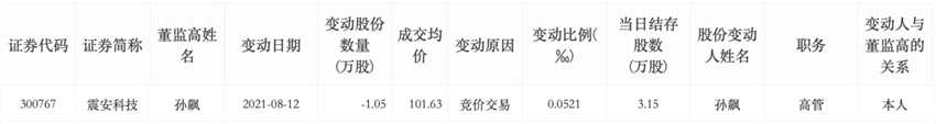 據深交所官網8月13日董監(jiān)高及相關人員股份變動情況變動信息顯示,震安科技(300767)副總經理孫飆于8月12日通過其本人證券賬戶賣出公司股票1.05萬股,成交均價101.63元/股,合計成交金額為106.71萬元。孫飆該交易行為構成窗口期違規(guī)買賣公司股票,或將遭交易所監(jiān)管關注。