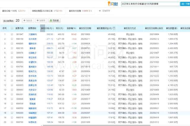 若從2020年1月1日開始統(tǒng)計,共有20只百元股,發(fā)行價超過200元的共有3只,分別是石頭科技(271.12元)、【福昕軟件(688095)、股吧】(238.53元)、康希諾(209.71元)。